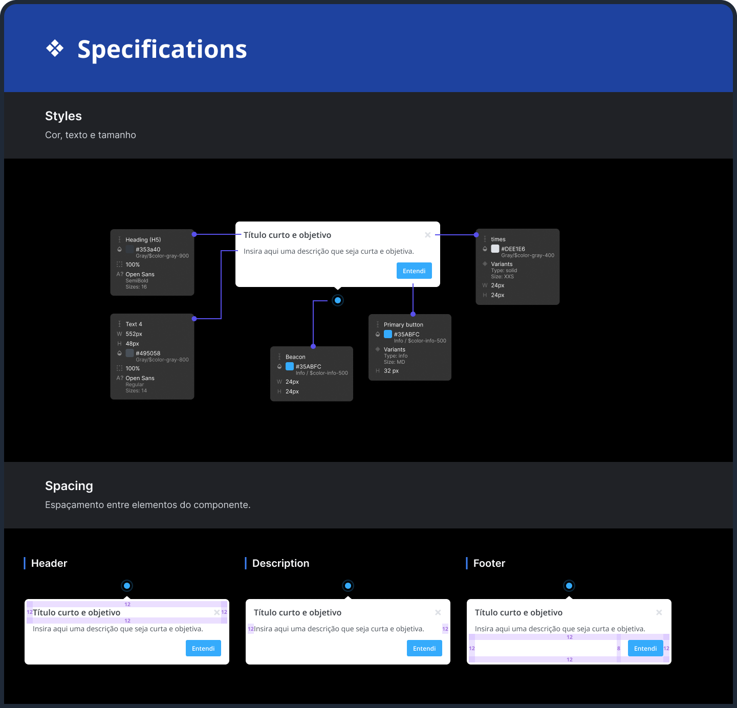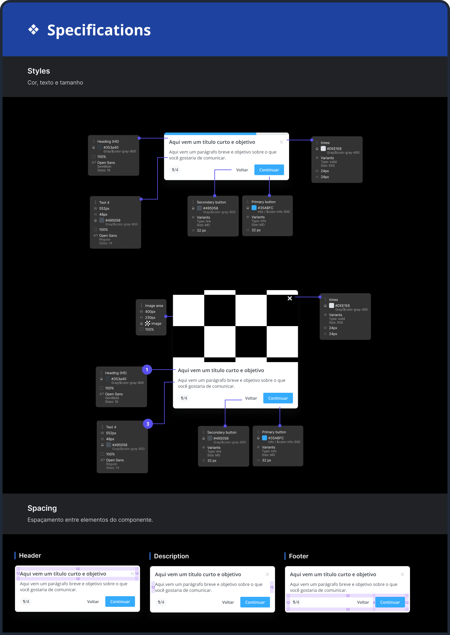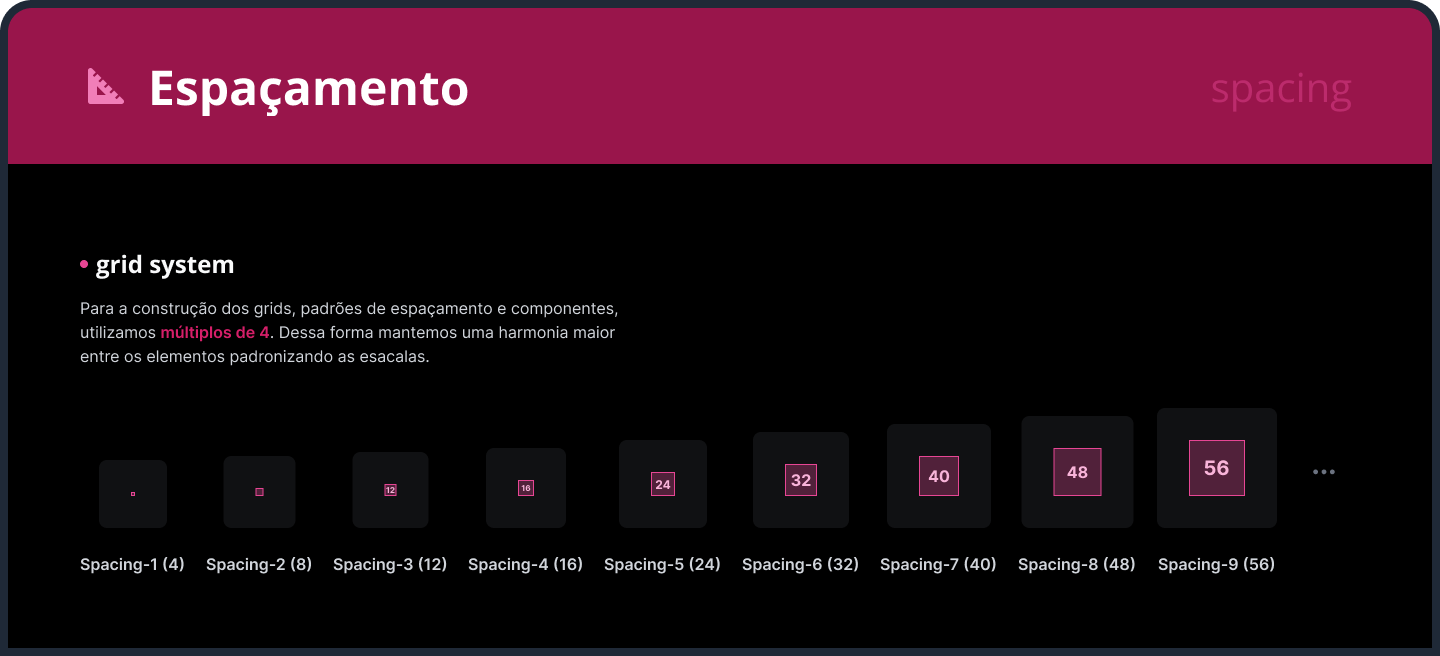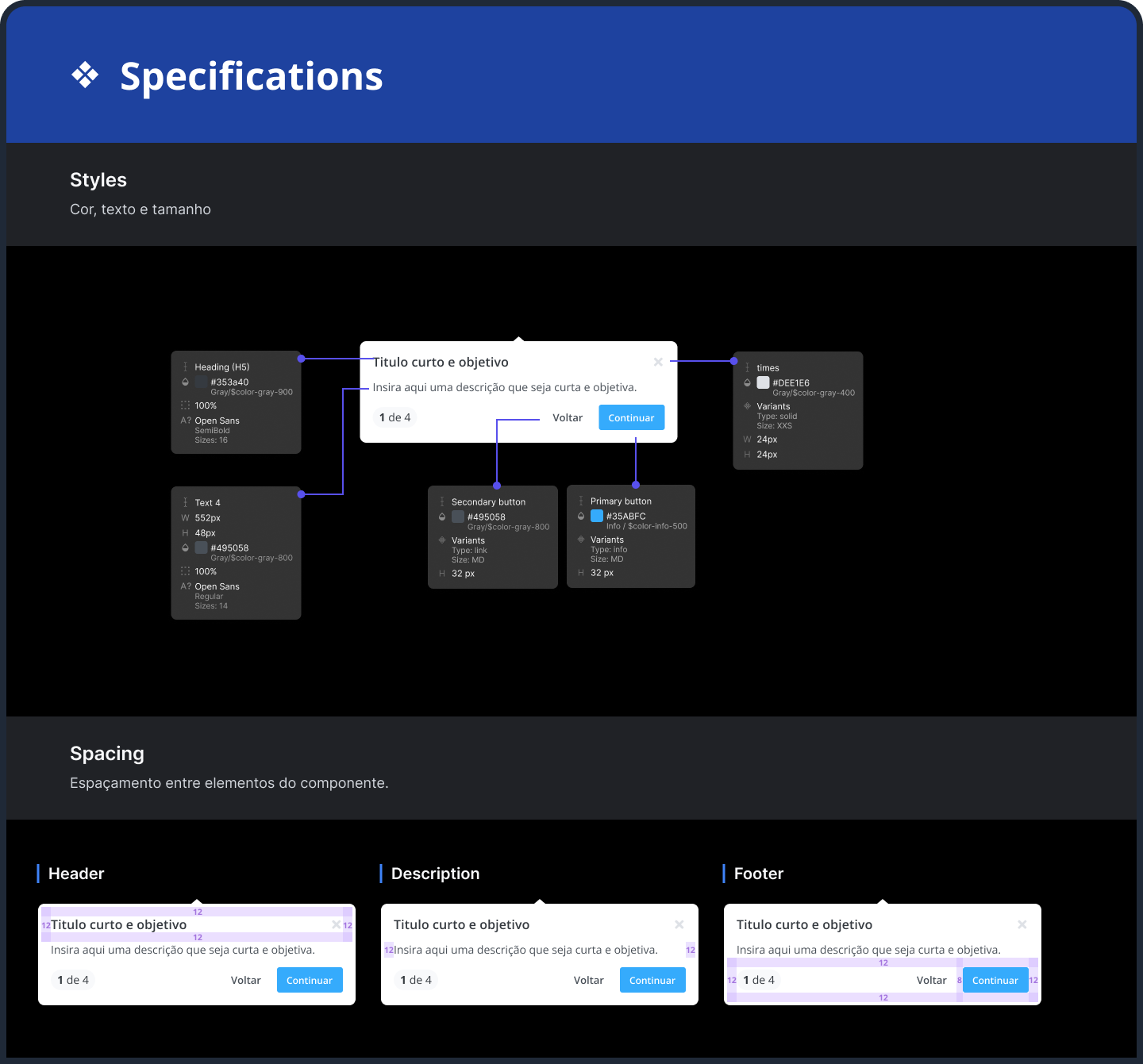 Buscando facilitar a aplicação por outros designers, eu projetei uma estrutura de interface totalmente componetizada com base nas regras de nosso design system. Os elementos básicos foram construídos com base na grid de 4 pontos, configurados (tamanhos, espaçamentos, ect) e utilizados como base para elementos mais complexos, desde indicadores de passos e botões a fluxos completos.