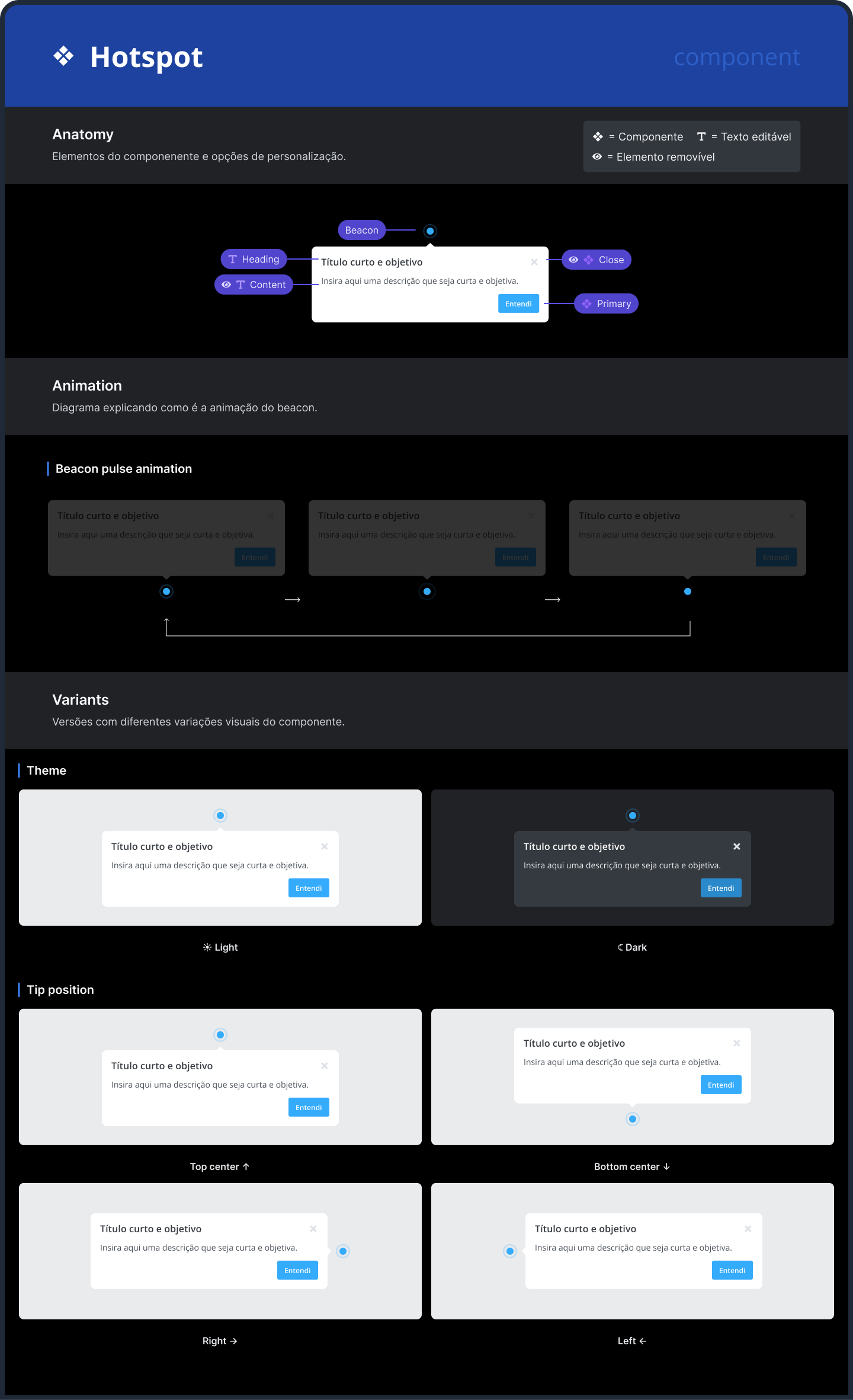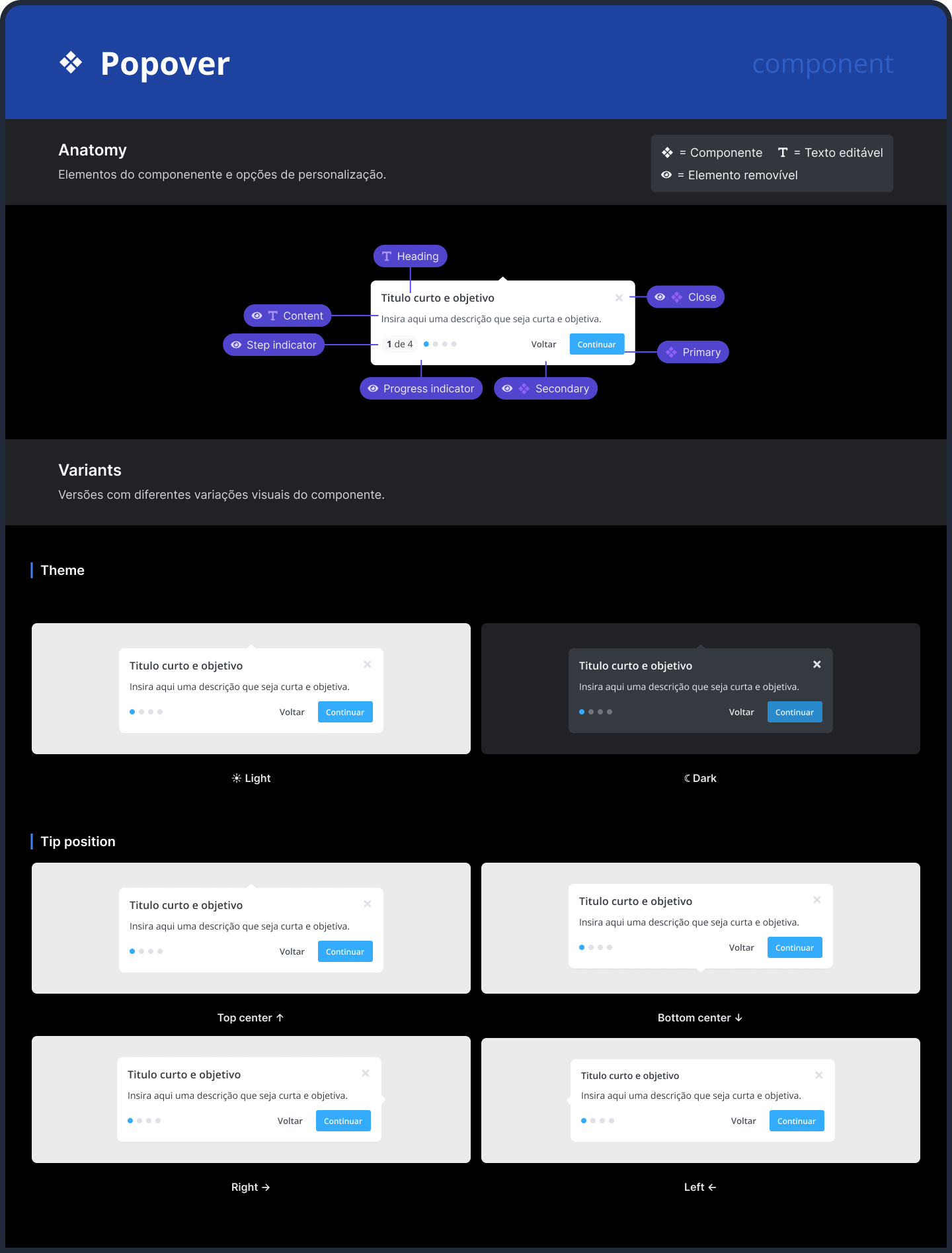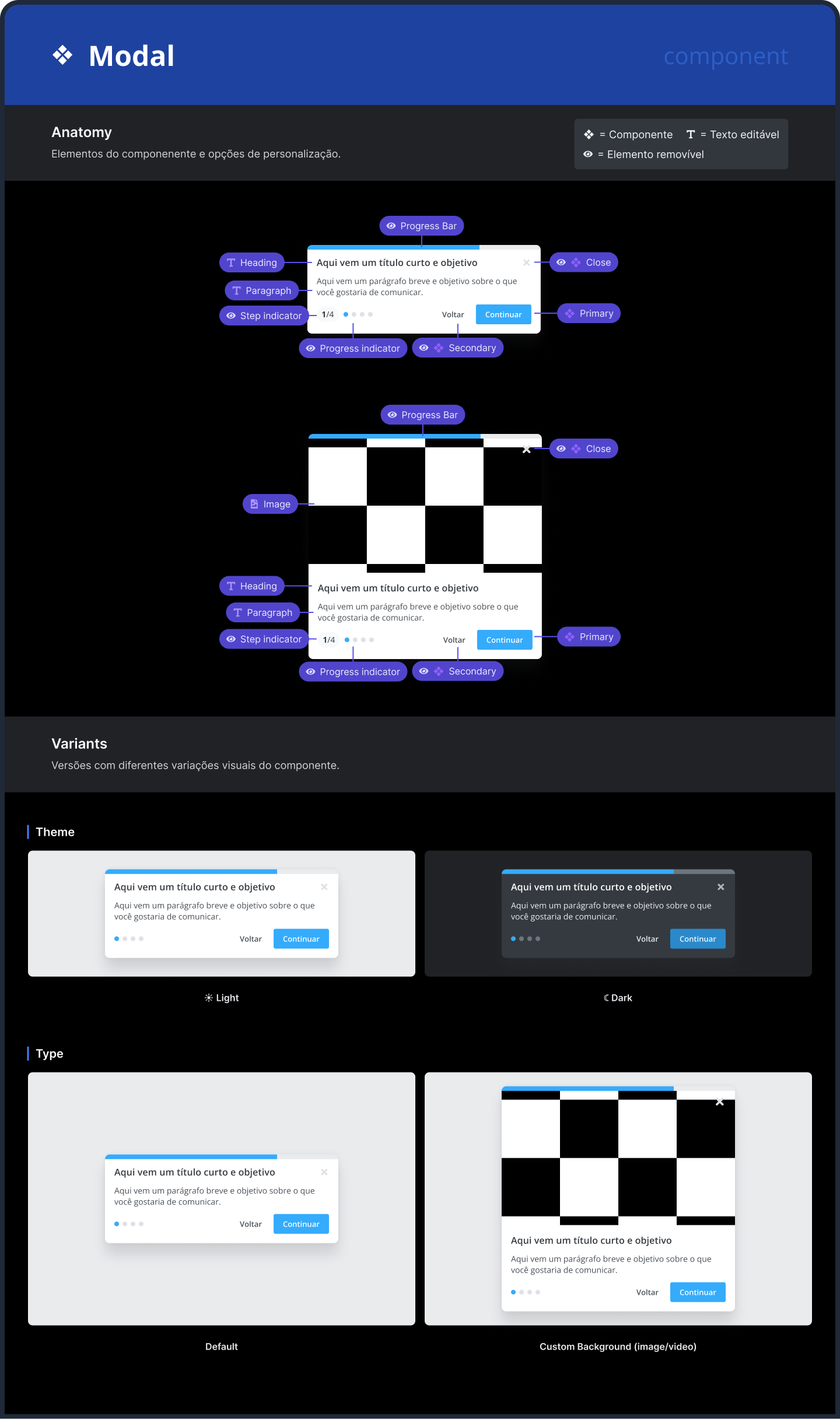 Buscando facilitar a aplicação por outros designers, eu projetei uma estrutura de interface totalmente componetizada com base nas regras de nosso design system. Os elementos básicos foram construídos com base na grid de 4 pontos, configurados (tamanhos, espaçamentos, ect) e utilizados como base para elementos mais complexos, desde indicadores de passos e botões a fluxos completos.