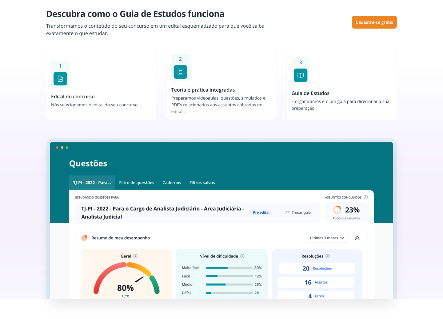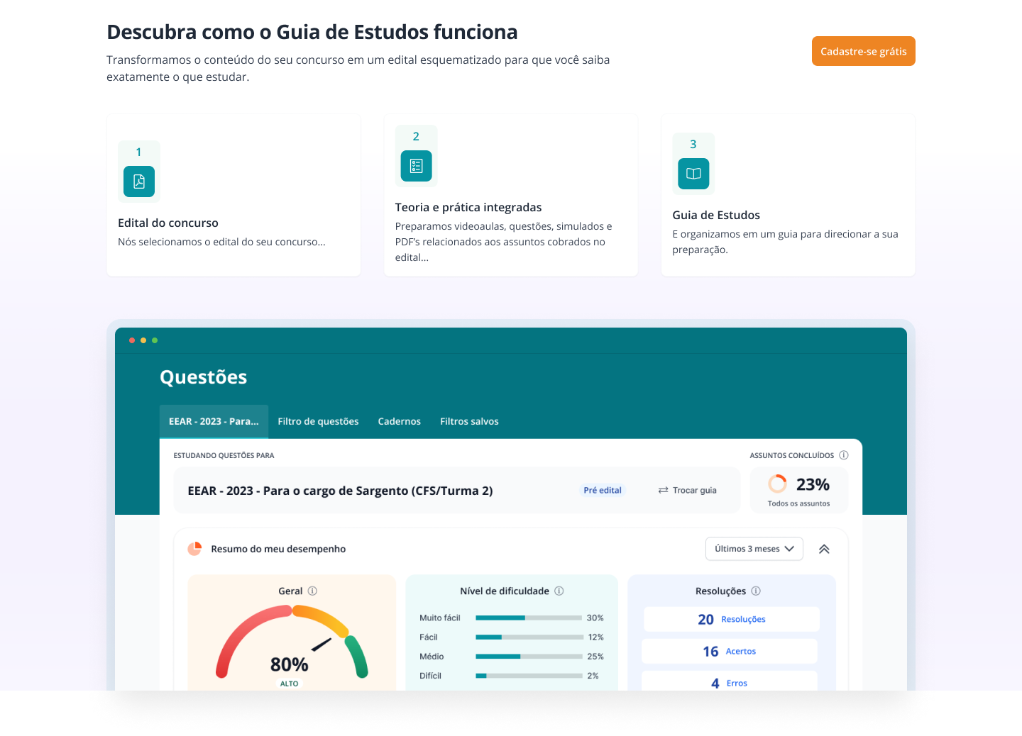 Eu anteciparia o processo de encontrar um guia de estudos para começar a estudar. Por exemplo: acrescentar uma seção em que o utilizador pudesse realizar a busca por um guia de estudos para o concurso público de seu interesse, podendo pré-visualizar o conteúdo elaborado.