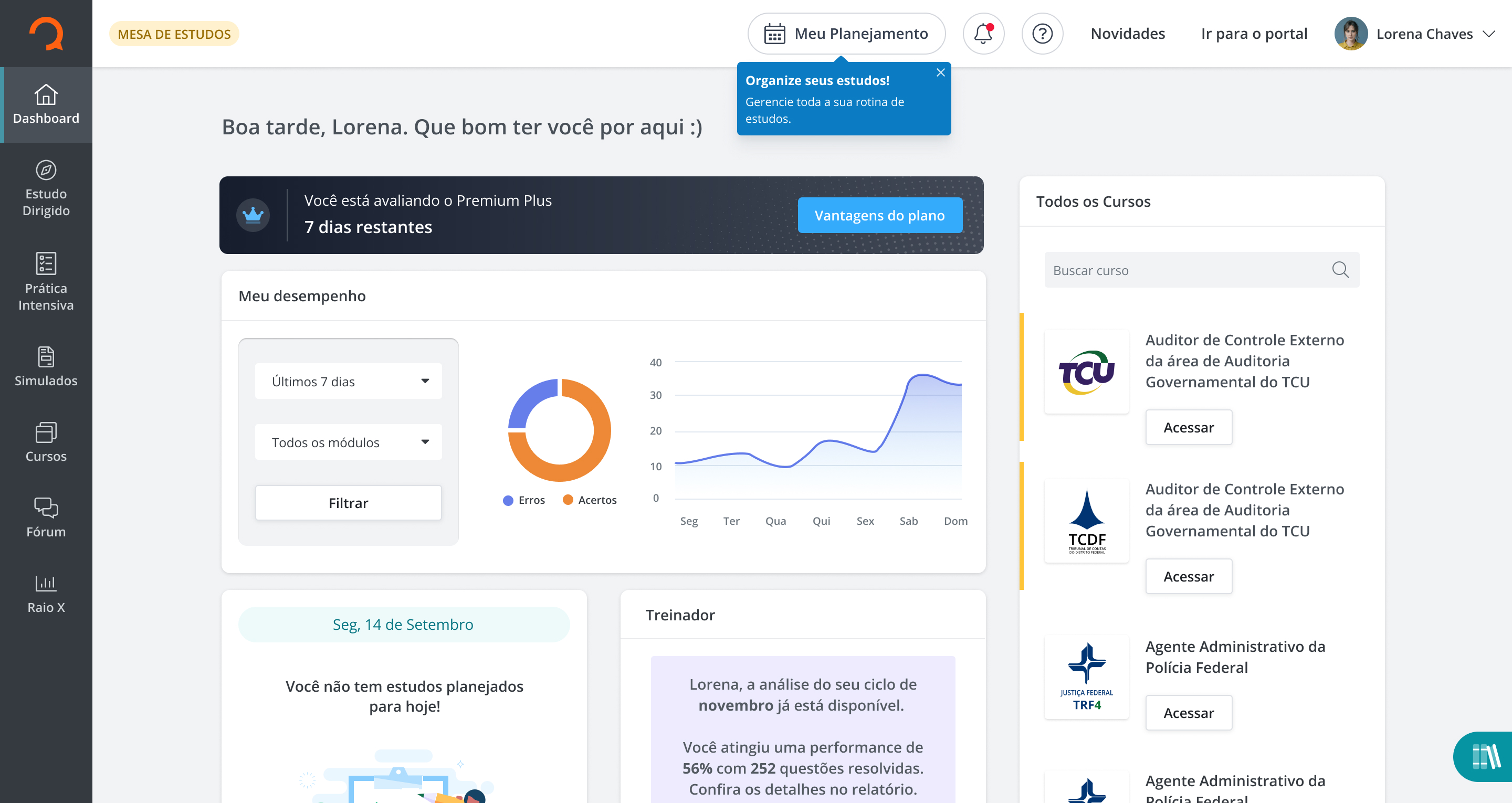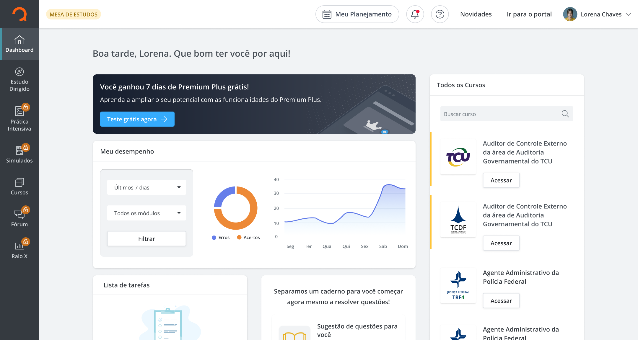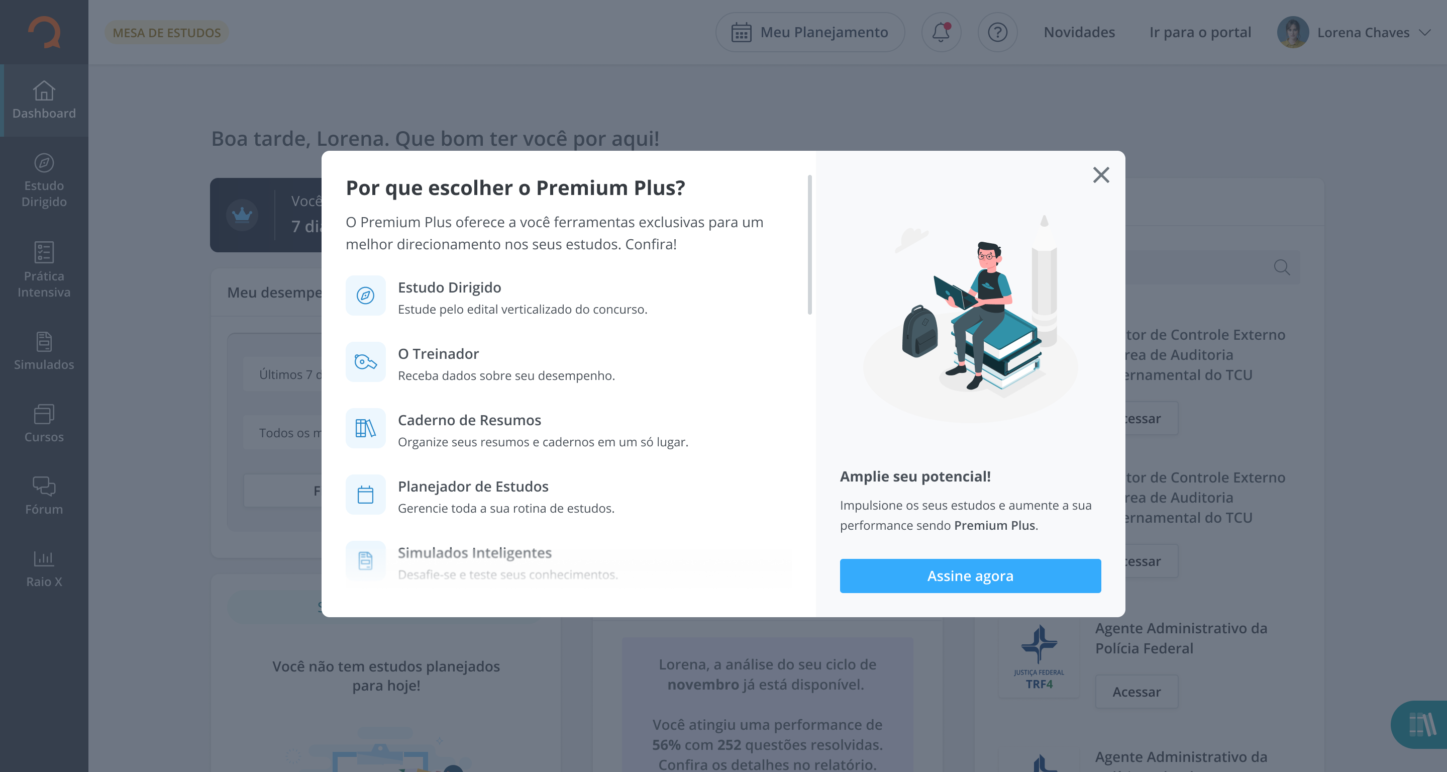 Pensando em tornar a jornada de estudos mais leve, organizada e prática, lançamos o plano Premium Plus que concentra em um único lugar o gerenciamento da rotina, a teoria necessária para cada objetivo, a prática através das questões, a revisão através de simulados e o acompanhamento do desempenho.