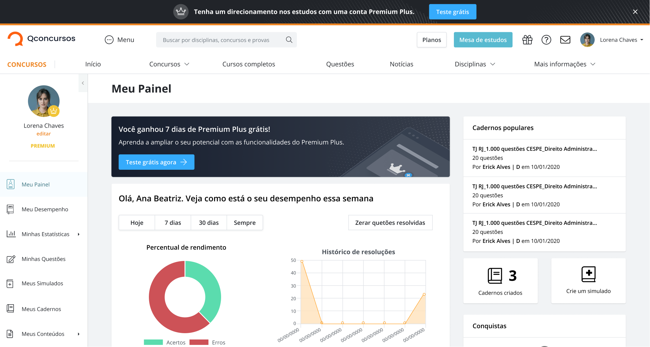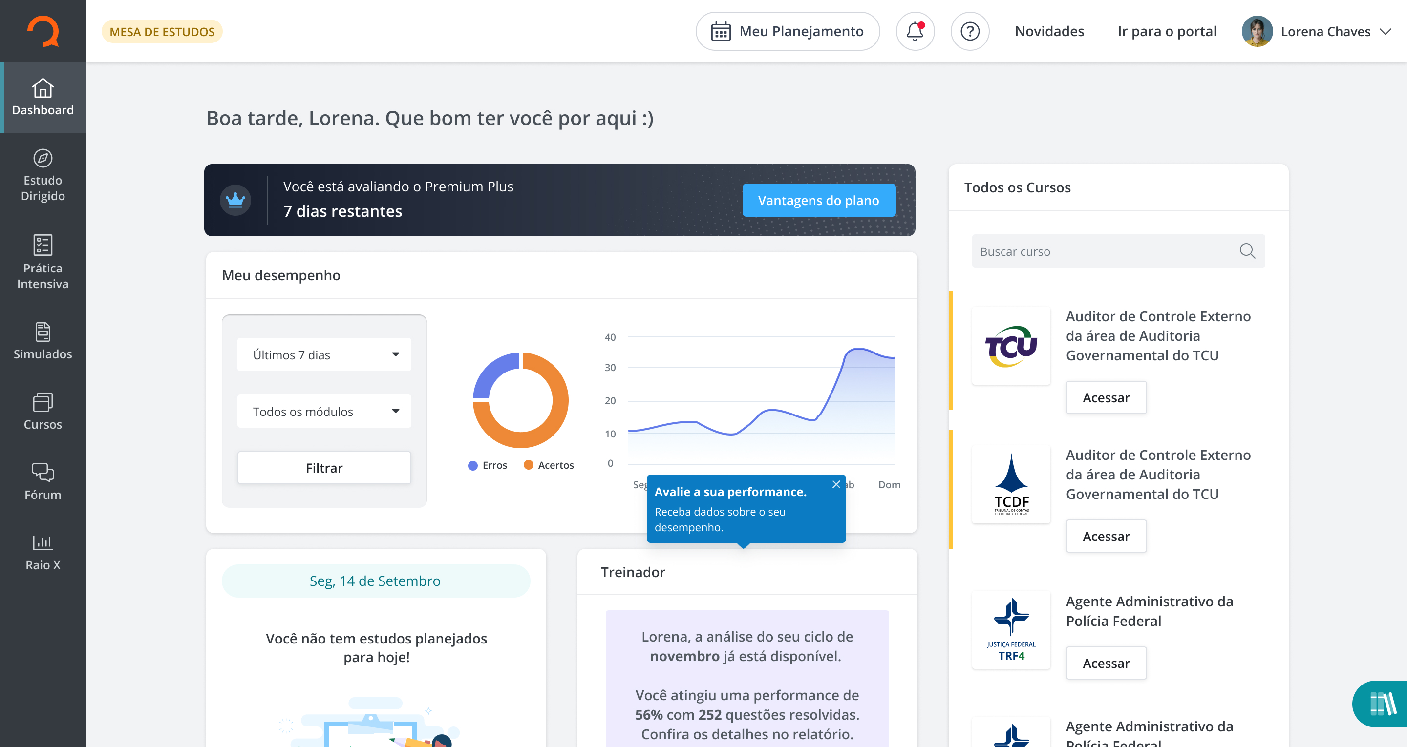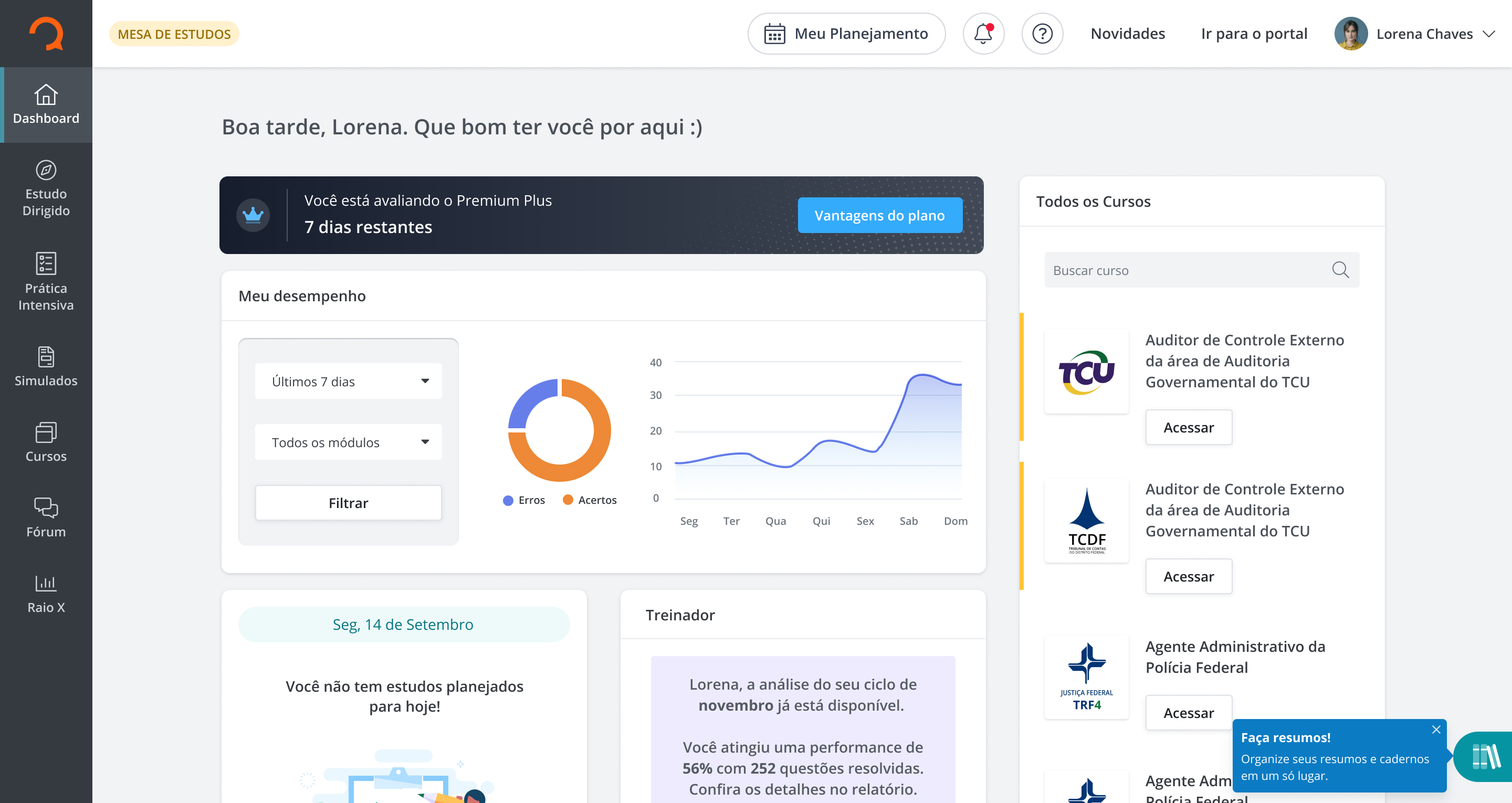 Pensando em tornar a jornada de estudos mais leve, organizada e prática, lançamos o plano Premium Plus que concentra em um único lugar o gerenciamento da rotina, a teoria necessária para cada objetivo, a prática através das questões, a revisão através de simulados e o acompanhamento do desempenho.